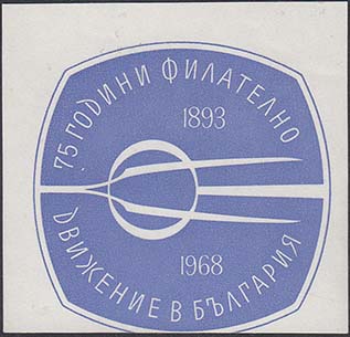 1968 г. Разм. рамки 46 х 46 мм. Одноцветная печать на белой бумаге. С клеем. В цент ре на сплошном фоне лупа, пинцет и даты: "1893 1968". По внутреннему периметру рамки текст на болгарском языке: "75 лет филателистическому движению в болгарии".
