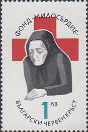 1980(?) г. Разм. по перфорации 29 х 44 мм. Двухцветная печать на белой глянцевой бумаге. Зубц. 13. С клеем. В центре пожилая женщина на фоне красного креста. Сверху полукругом текст на болгарском языке: "Фонд Милосердие". Внизу номинал и текст на болгарском языке: "Болгарский Красный Крест"