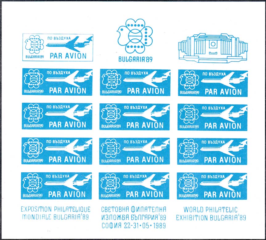 1998 г. Листок разм. 145 х 131 мм. Одноцветная печать на белой глянцевой бумаге. С клеем. В центре двенадцать виньеток авиапочты с символикой выставки. На полях листа символика выставки и текст на французском, болгарском и английском языках: "Всемирная филателистическая выставка Болгария -89".