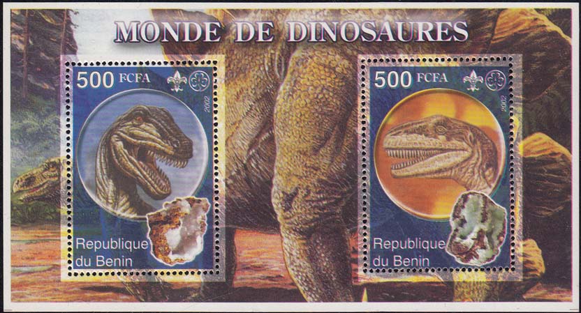 2002 г. Блок разм. 140 х 75 мм. Многоцветная печать на белой глянцевой бумаге. Зубц. 13 1/4. С клеем. В центре две марки с изображением динозавров. По периметру название страны и номинал. На полях блока изображение динозавра и текст на французском языке: "Мир динозавров".