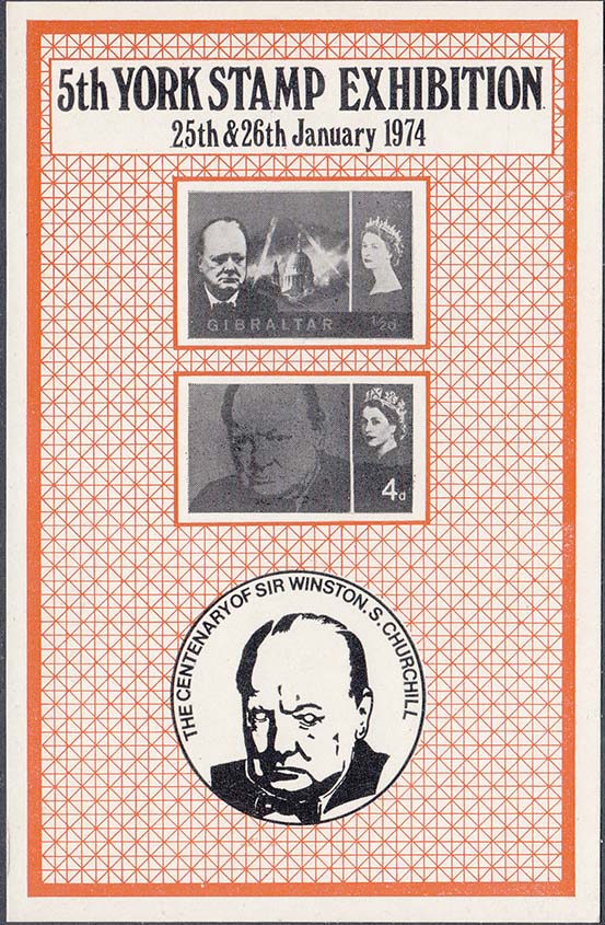 1974 г. Листок разм. 92 х 142 мм. Многоцветная печать на толстой белой глянцевой бумаге. В центре две почтовые марки с портретом У. Черчилля. Сверху текст в две строки на английском языке: "5-я выставка почтовых марок в Йорке 25 и 26 января 1974". Внизу в круглой рамке портрет У. Черчилля. По внутреннему периметру рамки текст на английском языке: "Столетие со дня рождения сэра Уинстона Черчилля".