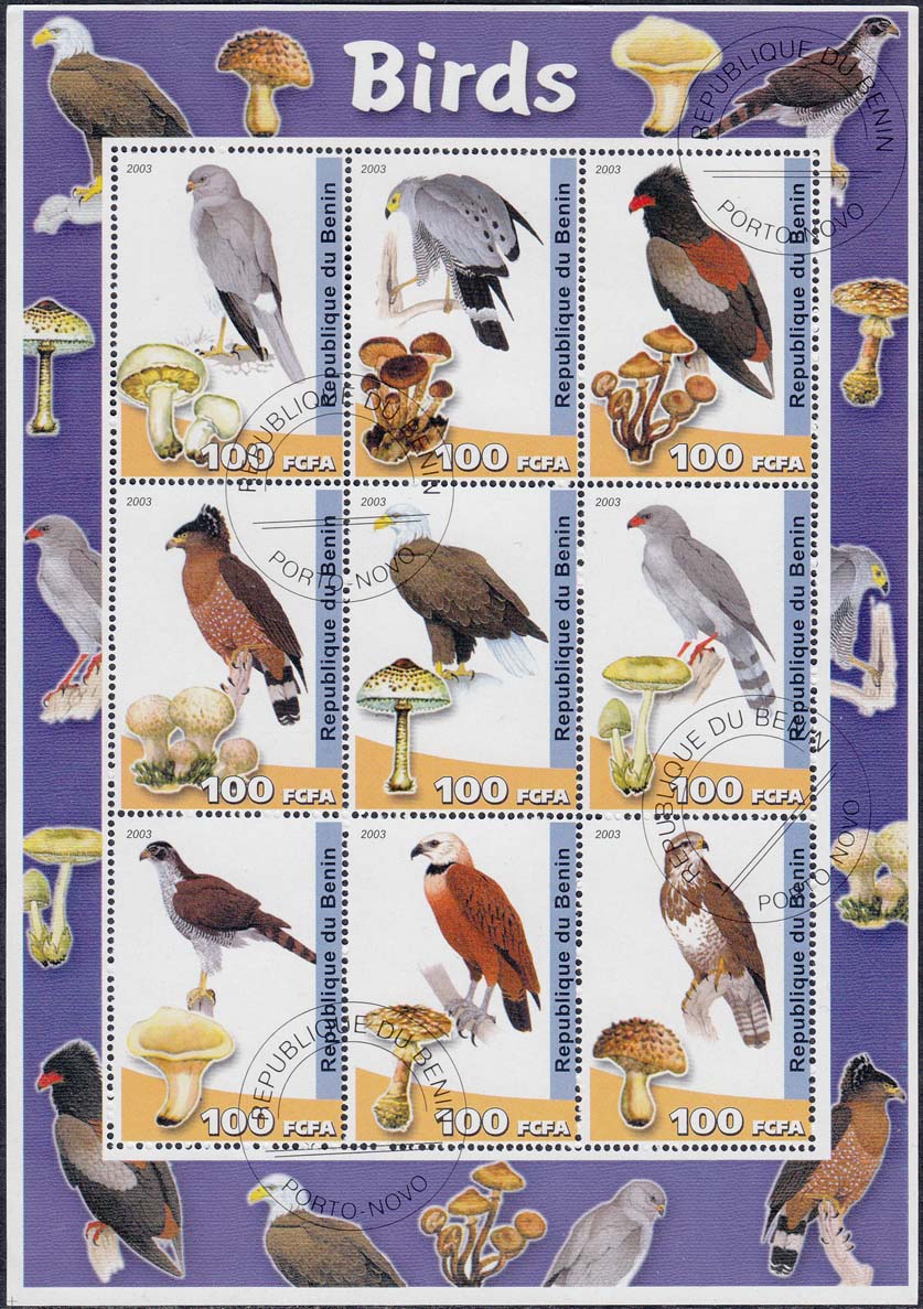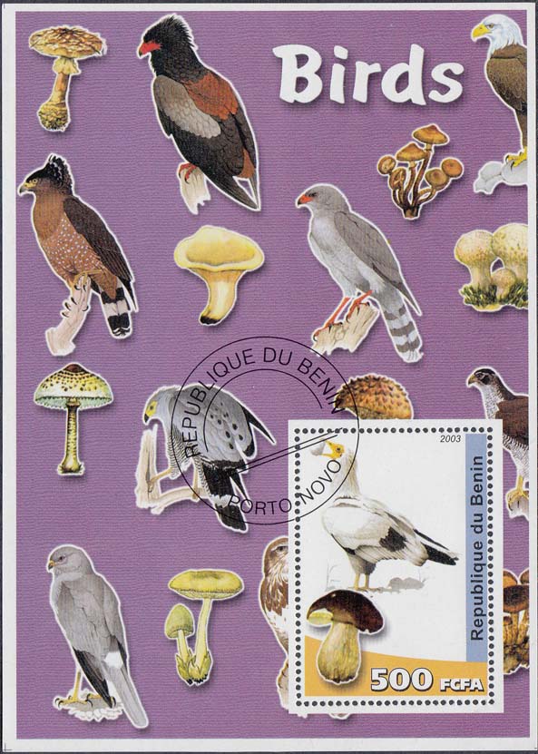 2003 г. Разм. 36 х 51 мм. Многоцветная печать на белой глянцевой бумаге. Зубц. 13 3/4. В центре птицы и грибы различных видов. По периметру номинал, название страны на французском языке и дата: "2003".