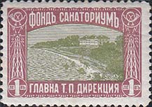 1930(?) г. Разм. рамки 33 22 мм. Двухцветная печать на белой мелованной бумаге. Зубц. 11 1/2. С клеем. В прямоугольной рамке в центре раз-личные рисунки. Сверху текст: «Фонд Санаториум».