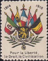 1916 г. Разм. по перфорации около 25 х 33 мм. Многоцветная печать на белой бумаге. Зубц. 11. С клеем. В центре флаги стран Антанты и союзников. Сверху по углам даты: "1914 1915". Внизу текст в две строки на французском языке: "За Свободу, Права и Цивилизацию".