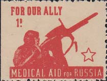1942(?) г. Разм. по перфорации разм. 35 х 26 мм. Одноцветная печать на белой бумаге. Нерегулярная зубц. С клеем. В центре стрелок за пулеметом и пятиконечная звезда. Сверху текст на английском языке: "Для наших союзников". Внизу текст на английском языке: "Медицинская помощь России".
