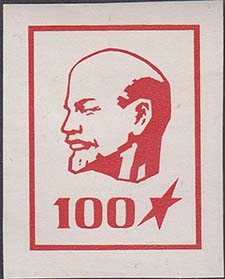 1970 г. Разм. рамки 28 х 37 мм. Одноцветная печать на белой глянцевой бумаге. С клеем. В центре портрет В.И. Ленина в профиль. Внизу пятиконечная звезда и цифра "100".