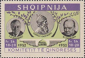 1951 г. Первый выпуск. Разм. рамки 44 х 38 мм. Многоцветная печать на белой бумаге. Зубц. 13 3/4. С клеем. В центре портреты Г. Кастриоти, Т. Рузвельта и У. Черчилля. Тексты на албанском языке и номинал.