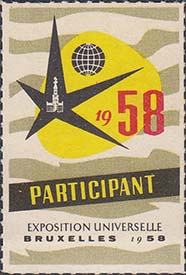 1958 г. Разм. по перфорации 31 х 56 мм. Многоцветная печать на белой бумаге. Линейная просечка. С клеем. В цен ре эмблема выставки и текст на французском языке.