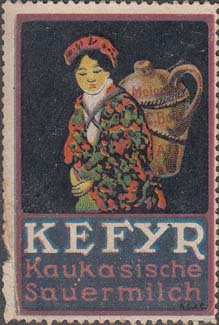 1914(?) г. Разм. 34 х 51 мм. Многоцветная печать на белой бумаге. Зубц. 11 1/4. С клеем. В центре на сплошном фоне женщина в национальном костюме с кувшином за спиной. Внизу текст на немецком языке в три строки: "Кефир. Кавказская простокваша".