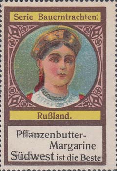 1913 г. Разм. рамки 35 х 55 мм. Многоцветная печать на белой бумаге. Зубц. 11 1/2. С клеем.\nВ центре в круглой декоративной рамке голова женщины в национальном головном уборе. Подпись к рисунку на немецком языке: "Россия". Сверху текст на немецком языке: "Серия деревенские костюмы". Внизу рекламный текст на немецком языке в три строки.