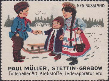 1913(?) г. Разм. по перфорации 61 х 45 мм. Многоцветная печать на белой бумаге. Зубц. 11 1/2. С клеем. В цент ре трое детей в национальных костюмах. В правом верхнем углу текст на немецком языке: "№5 Россия". Внизу текст в две строки на немецком языке.