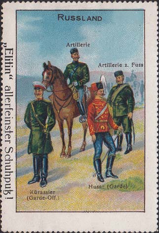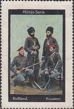 1912(?) г. Разм. рамки 44,5 х 69,5 мм. Зубц. 11 1/2. С клеем. Многоцветная печать на серой бумаге с мелованным верхним слоем. В прямоугольной рамке в центре солдаты различных родов войск российской императорской армии. Тексты на немецком языке.