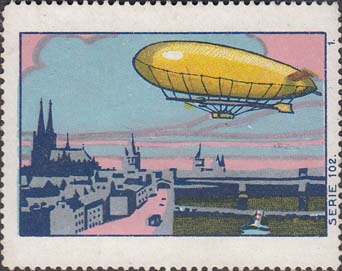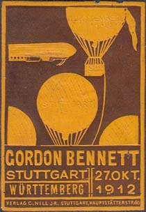 1912 г. 27.09.2012 Разм. 33 х 48 мм. Одноцветная и двухцветная печать с тиснением на бумаге различных цветов. С клеем. В прямоугольной рамке сверху дирижабль и три воздушных шара. Внизу текст на немецком языке: "Гордон Беннет. Штутгарт Вюртемберг. 27 окт[ября]. 1912". Внизу под рамкой выходные данные мелким шрифтом на немецком языке.