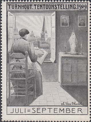 1909 г. Разм. рамки 48 х 66 мм. Одноцветная печать на белой бумаге. Зубц. 11 1/2. С клеем. В центре женщина, сидящая на стуле у открытого окна. тексты на немецком языке.