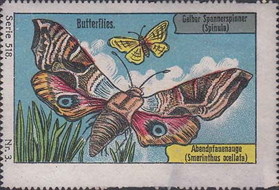 1912(?) г. Бабочки. Разм. рамки 60 х 37 мм. Многоцветная печать на белой бумаге. Зубцевидная просечка 13. С клеем. В центре бабочки различных видов. Тексты на немецком языке.