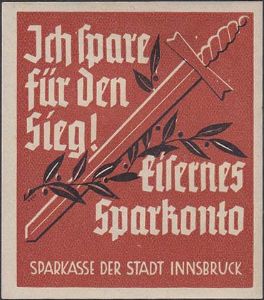 1934(?) г. Разм. 57 х 65 мм. Двухцветная печать на белой бумаге. С клеем. В центре на сплошном фоне меч и лавровая ветвь. Тексты на немецком языке.