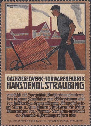 1913 г. Разм. по перфорации 50 х 71 мм. Многоцветная печать на белой бумаге. Зубц. 11 1/2. С клеем. В центре рабочий с тачкой на фоне завода. Внизу тексты на немецком языке.
