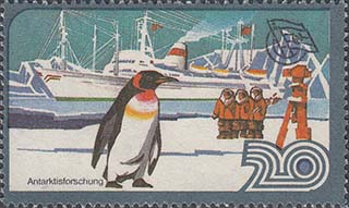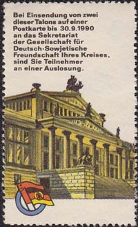 1980(?) г. Разм. по перфорации 33 х 56 мм или 56 х 33 мм. Многоцветная печать на белой бумаге. 13 1/4. С клеем. В центре репродукции картин советских художников с пояснительными подписями на немецком языке. Эмблема общества и номинал.