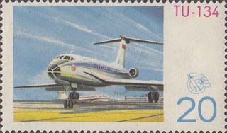 1967(?) г. Разм. по перфорации 54 х 31 мм. Многоцветная печать на белой бумаге. 13 1/4. С клеем. Слева различные рисунки, изображающие самолеты СССР различных видов. В правом верхнем углу пояснительная подпись к рисунку. Внизу эмблема и цифра номинала «20».