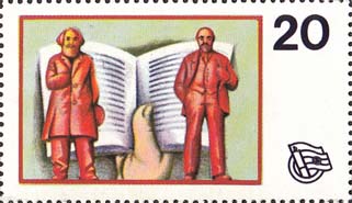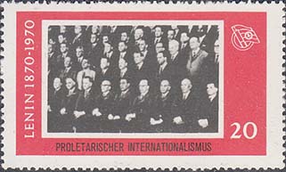 1970 г. Разм. рис. 47 х 27 мм. Двухцветная печать на белой бумаге. Зубц.13 1/2. В центре в рамке группа партийных работников. Внизу под рамкой текст на немецком языке: "Пролетарский интернационализм". Слева вертикально текст на немецком языке: "Ленин 1870 - 1970". Справа эмблема общества и номинал.