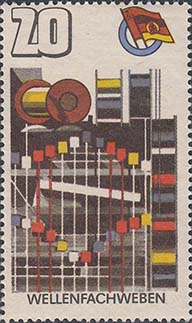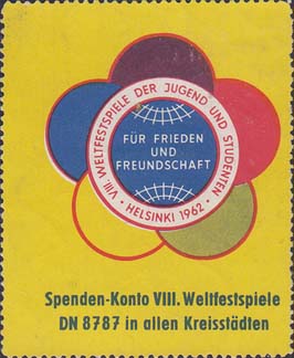 1962(?) г. Разм. по перфорации 45 х 60 мм. Многоцветная пеать на белой бумаге. Зубц. 13 1/2. С клеем(?). На сплошном фоне в центре эмблема Фестиваля молодежи и студентов. Тексты на немецком языке.