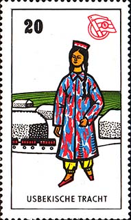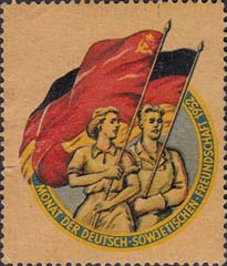 1980(?) г. Разм. рамки. 27 х 48 мм. Многоцветная печать на белой бумаге. Зубц. 13 1/2. С клеем. В центре представители союзных республик СССР в национальных костюмах. Внизу пояснительная подпись на немецком языке. Сверху номинал и эмблема общества.