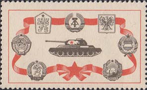 1965(?) г. Разм. рамки 45 х 25 мм. Двухцветная печать на белой бумаге. Зубц 13 1/2. С клеем. В прямоугольной рамке в центре танк в профиль в обрамлении ленты с гербами стран членов Варшавского договора: СССР, Чехословакии, ГДР, Польши, Венгрии, Румынии, Болгарии.