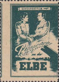 1948(?) г. Разм. рамки 28 х 40 мм. Одноцветная печать на белой бумаге. Зубц. 11 1/4 х 10 3/4. С клеем(?). Сцена из фильма "Встреча на Эльбе". Текст на немецком языке: "Совэкспортфильм показывает: "Встреча на Эльбе"".