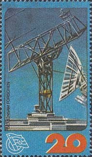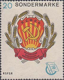 1976 г. Разм. рис. 27 х 42 мм. Многоцветная печать на белой бумаге. Зубц. 13 1/2. с клеем. В центре различные виды городов СССР. Сверху герб соответствующей союзной республики. Внизу пояснительная подпись на немецком языке, эмблема общества и номинал.