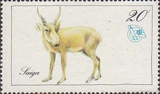 1976(?) г. Разм. рамки 48 х 27 мм. Многоцветная печать на белой бумаге. Зубц. 13 1/2. С клеем. В прямоугольной рамке в центре различные животные и пояснительная подпись. эмблема общества и номинал.