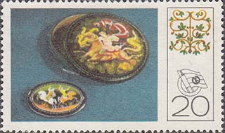 1980(?) г. Разм. по перфорации 54 х 32 мм. Многоцветная печать на белой бумаге. Зубц. 13 1/2. С клеем. Слева в прямоугольной рамке различные предметы декоративно прикладного искусства СССР. Справа в прямоугольной рамке декоративные элементы, эмблема общества и номинал.