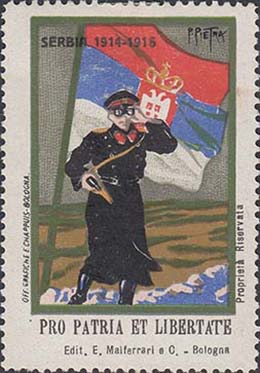 1915 г. Разм. рамки 36 х 50 мм. Многоцветная печать на белой бумаге. Зубц. 10. С клеем. В прямо-угольной рамке в центре различные рисунки. Внизу текст на итальянском языке: «За Родину и свободу». Внизу выходные данные на итальянском языке мелким шрифтом.