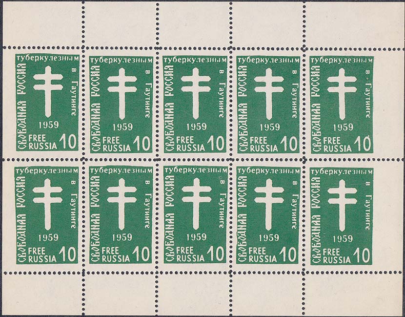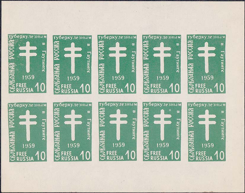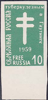 1959 г. 14.11.1959 Г. Разм. рис. 21 х 34 мм. Одноцветная печать на апрстой белой бумаге. Зузц. 11 3/4 и Б.З. С клеем. В центре на сплошном фоне Лотарингский крест и дата: "1959". Тексты на русском и английском языках и номинал.