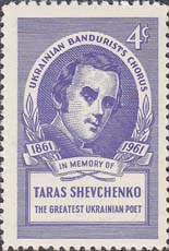 1961 г.   Разм. рис. 21,5 х 34,5 мм. Одноцветная печать на белой бумаге. Зубц. лин. 12 1/2. С клеем. В центре в декоративной рамке портреты Т.Г. Шевченко в разные периоды жизни. Текст на английском языке: "Украинская капелла бандуристов. 1861 1961. В память о Тарасе Шевченко, величайшем украинском поэте".