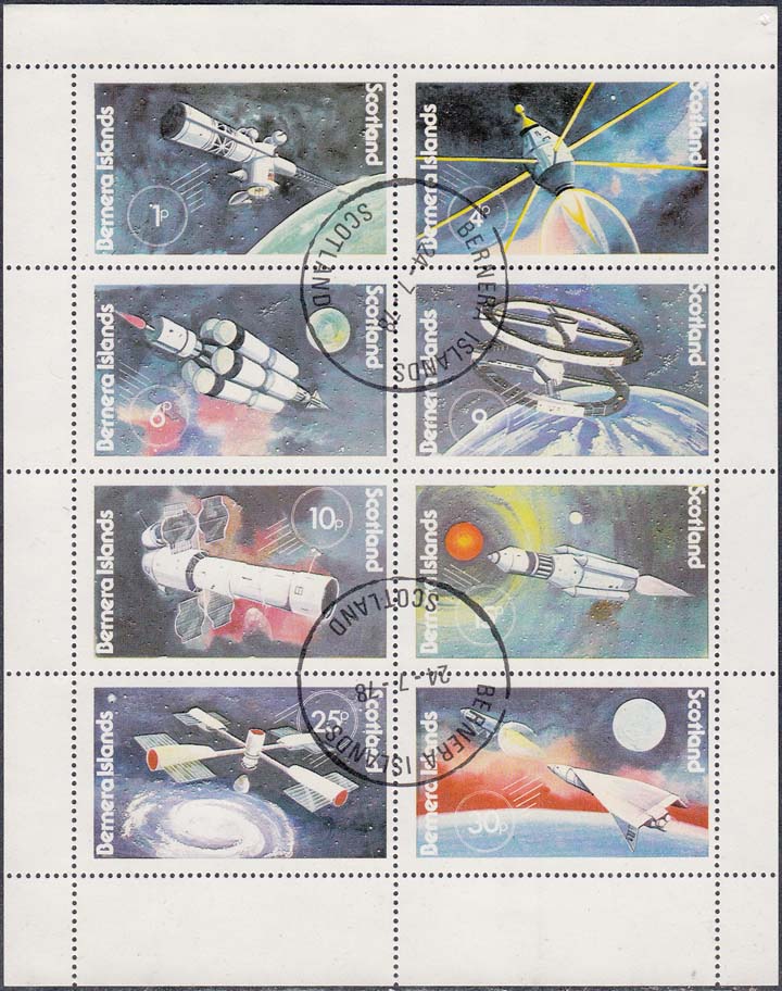 1978 г. Разм. рис. 45 х 27 мм. Многоцветная печать на белой мелованной бумаге. Зубц. 14. В центре различные рисунки космической тематики. По периметру название страны на английском языке и номинал.