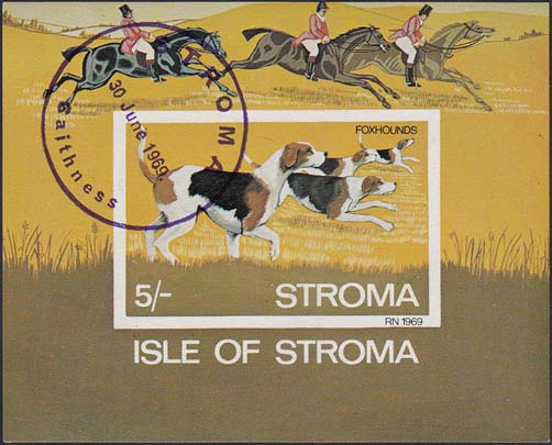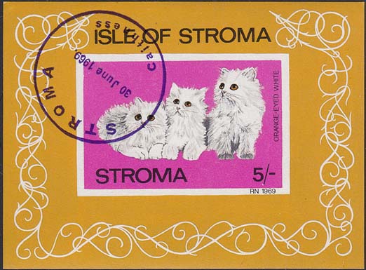 1969 г. Блок разм. 84 х 67 мм. Многоцветная печать на белой бумаге. С клеем. В центре на марке раз-личные рисунки. Внизу номинал и название территории на английском языке. На полях блока продолжение рисунка и текст на английском языке: «Остров Строма».