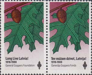 1988 г. Разм. рис. 22 х 38 мм. Многоцветная печать на белой глянцевой бумаге. Зубц. 12 1/2. С клеем. В центре ветка дуба с желудем. Внизу текст на английском и латышском языке, а также эмблема и название организации.