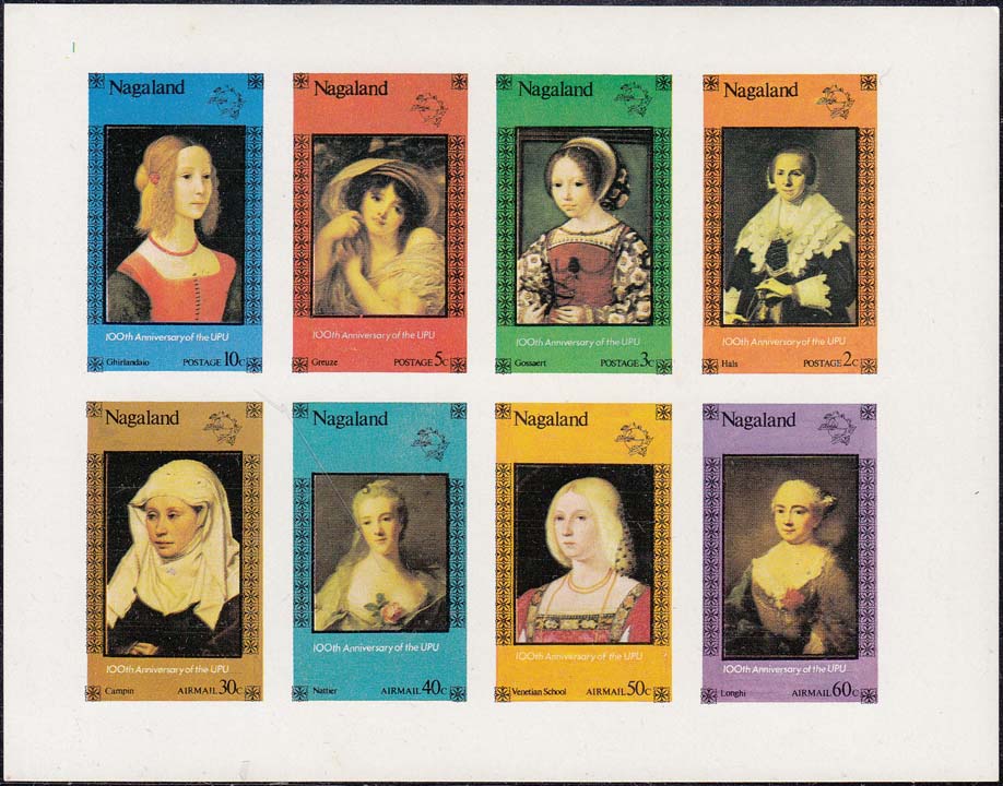 1974 г. Разм. рис. 26 х 46 мм. Многоцветная печать на белой глянцевой бумаге. Зубц. 14 1/4 и БЗ. В центре репродукции картин. Сверху название территории на английском языке. Внизу пояснительная подпись на английском языке и номинал.