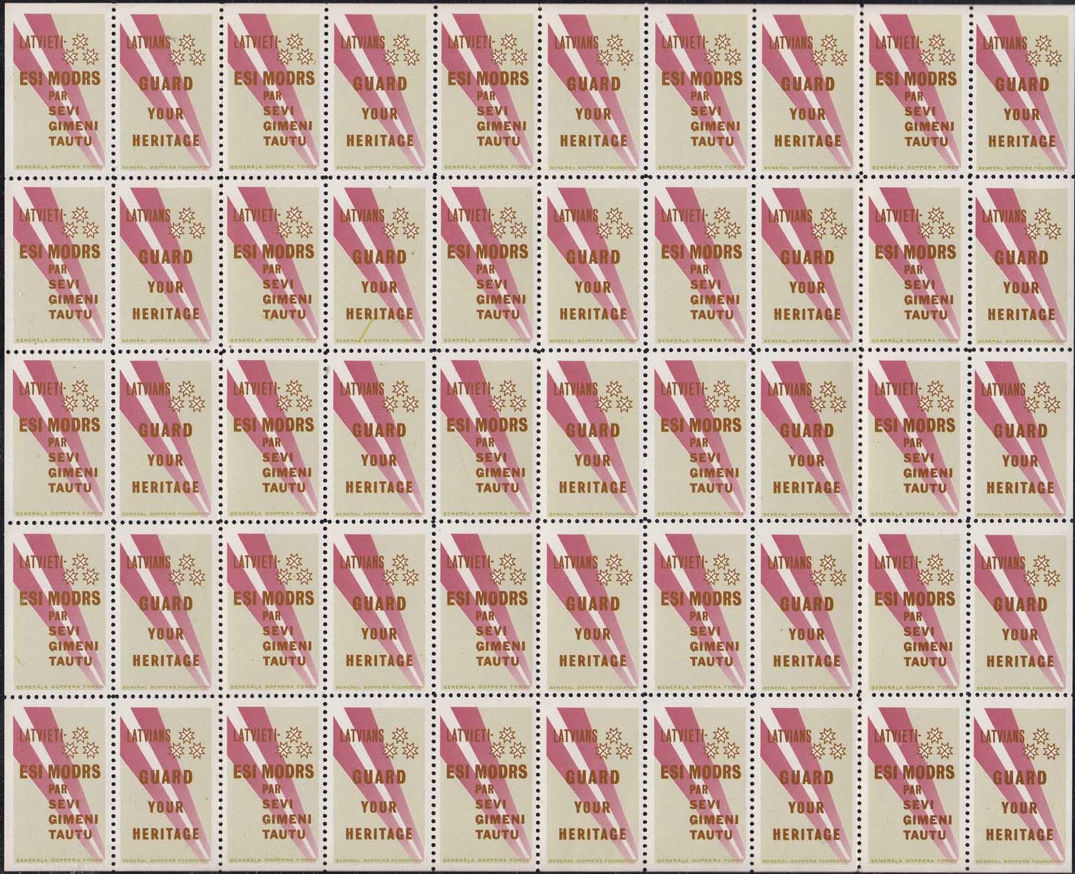 1975 г. Разм. по перфорации 26 х 41 мм. Трехцветная печать на белой глянцевой бумаге. Зубц. лин. 10 3/4. С клеем. В центре аллегорический рисунок. Тексты на латышском и ли английском языках.