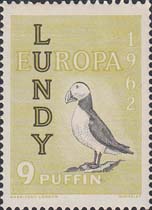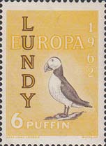 1962 г. 26.09.1962 г. Разм. рис. 23 х 30 мм. Многоцветная печать на белой глянцевой бумаге. Зубц. 14 1/2 и Б.З. В центре изображение атлантического тупика (Fratercula arctica). По периметру тексты на английском языке: "Ланди Европа" и номинал.