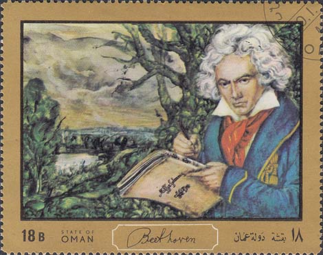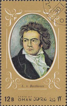 1972(?) г. Разм. по перфорации 39 х 63 и 80 х 63 мм. Многоцветная печать на белой бумаге. Зубц. 11 1/4. В центре различные портреты Бетховена. Тексты на английском и на арабском языке.