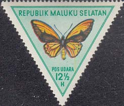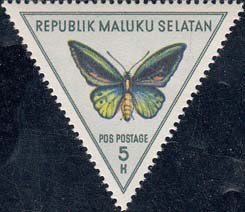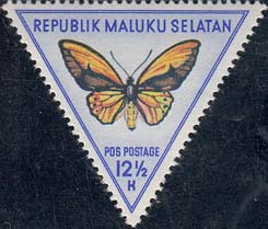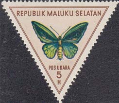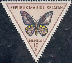 1954 г. Разм. рамки 36 х 31 мм. Многоцветная печать на печать на белой бумаге. Зубц. 14. С клеем. В центре изображение бабочек различных видов. Сверху название страны: «Republik Maluku Selatan». Внизу номинал.