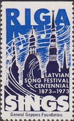 1972 г. Разм. по перфорации. 26 х 43 мм. Двухцветная печать белой мелованной бумаге. Зубц. 12 1/2. С клеем. Вид Риги и ноты. Текст на латышском или на английском языках.