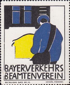 1912 г. Разм. по перфорации 46 х 54 мм. Многоцветная печать на белой бумаге. Зубц. 11 1/2. С клеем. В центре различные рисунки. Внизу текст на немецком языке: "Баварская ассоциация дорожных служащих". Внизу выходные данные мелким шрифтом на немецком языке.