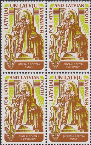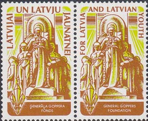 1989 г. Разм. рис. 22 х 38 мм. Многоцветная печать на белой глянцевой бумаге. Зубц. 12 1/2. С клеем. В центре скульптурная композиция. Сверху полукругом текст на английском и латышском языке: "Для Латвии и латвийской молодежи". Внизу эмблема и название организации на латышском или английском языке.