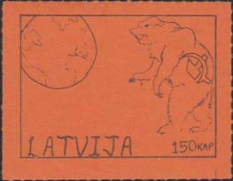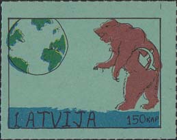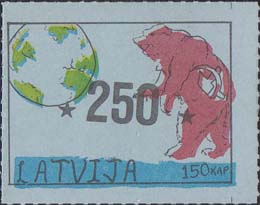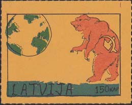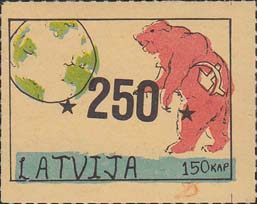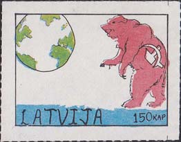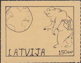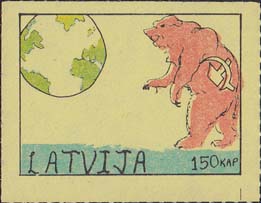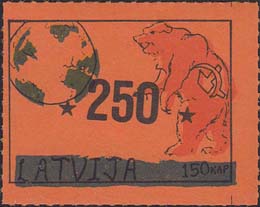 1980(?) г. Разм. по перфорации ≈ 45 х 34 мм. Одноцветная и многоцветная печать на бумаге различных цветов. Линейная просечка. С клеем. В прямоугольной рамке разм. 37 х 27 мм примитивный рисунок. Земной шар и медведь с серпом и молотом. Внизу текст на английском языке: "Латвия" и номинал.