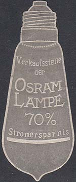 1912(?) г.   Виньетка сложной формы в виде электрической лампы с патроном цоколем вверх разм. 25 х 61 мм. Текст в шесть строк на немецком языке.