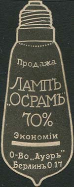 1912(?) г. Виньетка сложной формы в виде электрической лампы с патроном цоколем вверх разм. 25 х 61 мм. Текст в шесть строк на немецком языке.